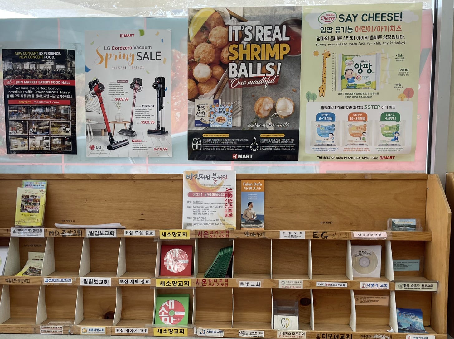 When I first started to think about H Mart as a possible chapter in the dissertation, I explained to my dissertation advisor (after we moved to Annapolis, MD in 2020) I went to the H Mart in Ellicot City for the first time and saw this pictured below—in the narthex space of the exit there was a large wall dedicated to promoting the churches in the area. I wasn’t surprised, but it made me pause. I remembered seeing it in my childhood H Mart, too.